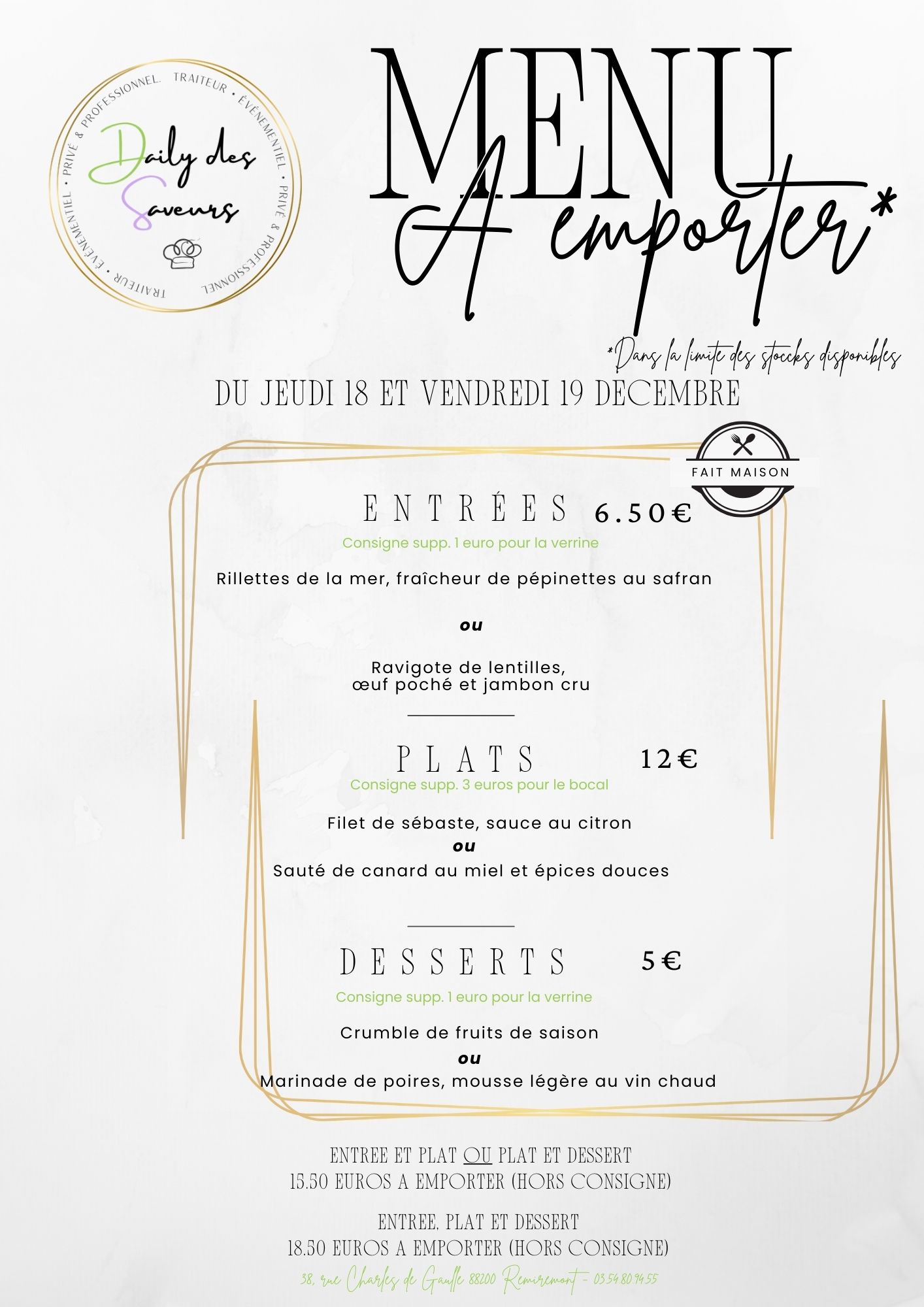 Daily des saveurs, son nom, se déclinera aussi avec une boutique traiteur à emporter, de la livraison (domicile ou travail selon disponibilités), Chef à domicile, cours de cuisine, cocktail d entreprise... sans oublier nos prestations pour les fêtes de fin d'année.